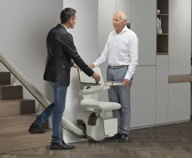 Viele Sitzlifte sind so konstruiert, dass sich Sitz, Armlehnen und Fußstütze einklappen lassen. Das reduziert die Treppenlift Breite im Alltag deutlich. Gleichzeitig gilt: Für Komfort und Sicherheit ist eine sehr knapp geplante Lösung oft nur ein Kompromiss.